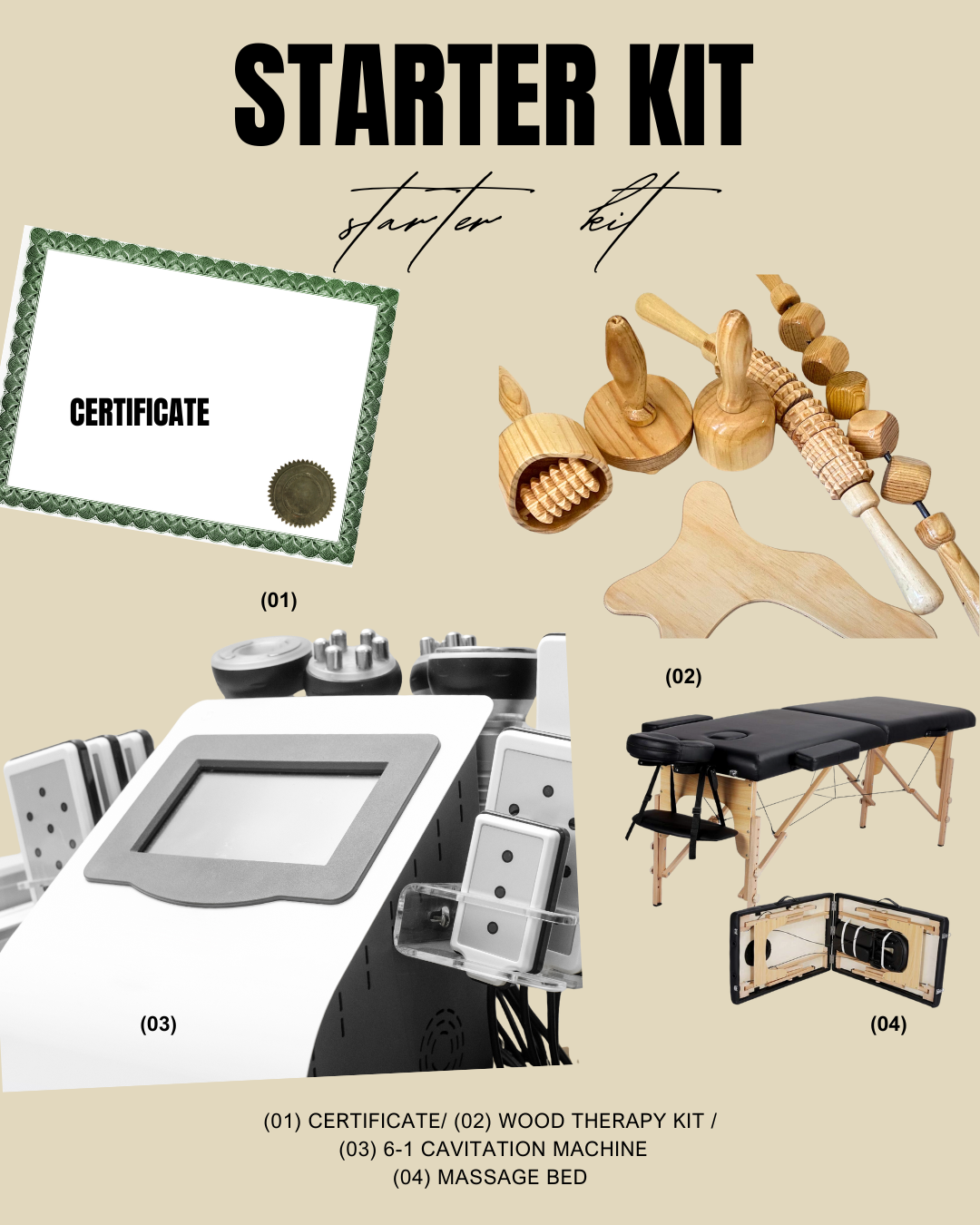 Starter Kit: 6-in-1 Cavitation Machine + Wood Therapy Tools & massage bed.